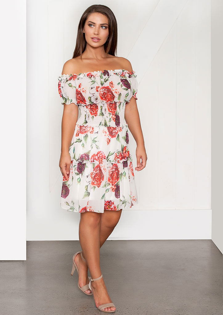 V534S19 | Off Shoulder Shirred Waist Dress | Very Very